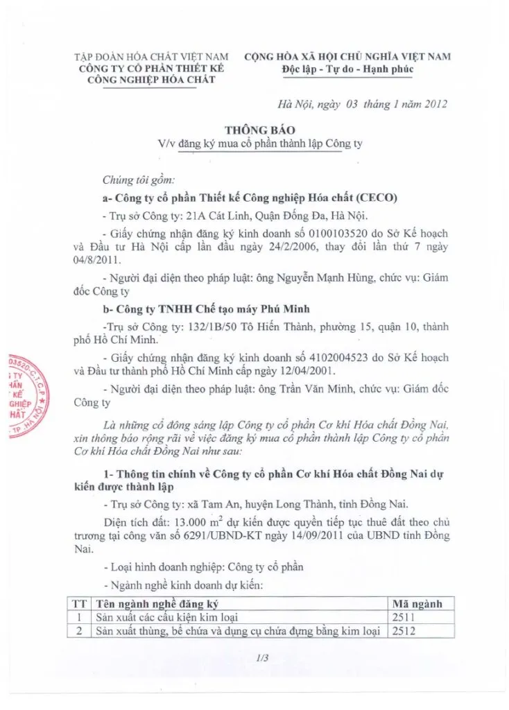 Thông báo đăng ký mua Cổ phần Công ty Cơ khí Đồng Nai