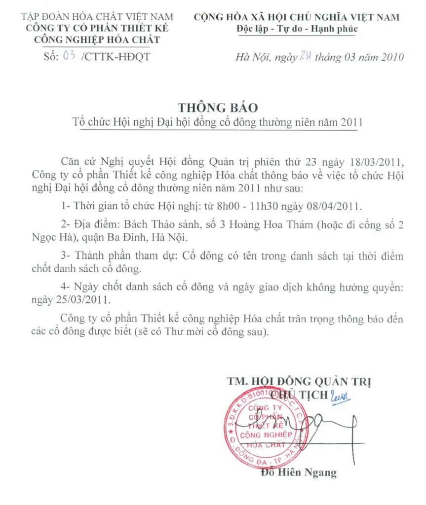 Thông báo Tổ chức Hội nghị Đại hội đồng cổ đông thường niên 2011