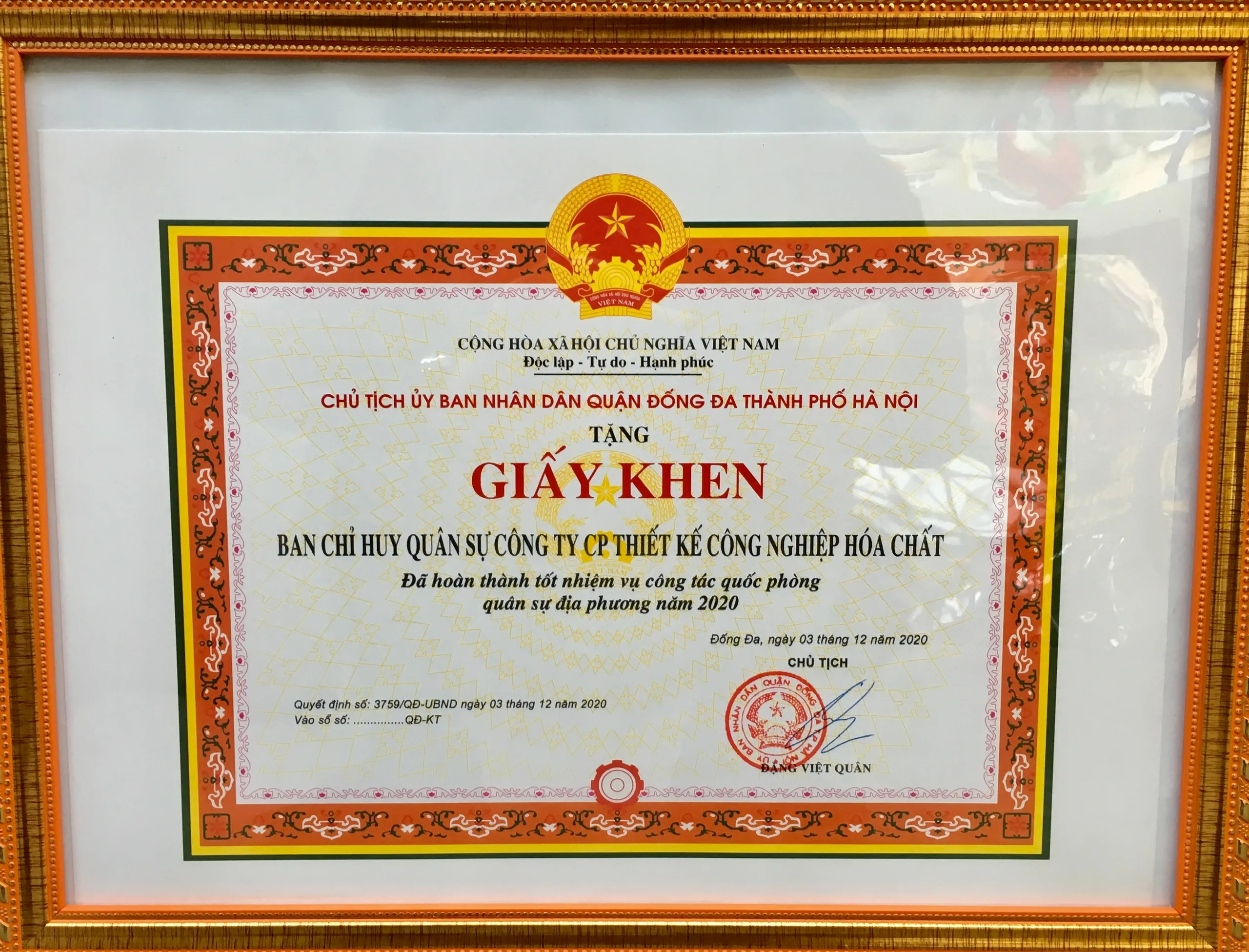Tại Hội nghị tổng kết công tác quốc phòng địa phương năm 2020, Ban CHQS Công ty Cổ phần Thiết kế Công nghiệp Hóa chất đã vinh dự được Chủ tịch Ủy ban Nhân dân Quận Đống Đa tuyên dương và tặng Giấy khen hoàn thành tốt nhiệm vụ công tác quốc phòng địa phương năm 2020.